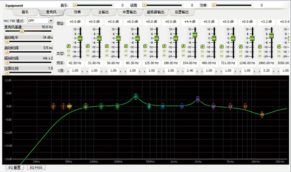 5.1數字機 此系列產品是具有音箱處理器功能的卡拉OK效果器,每部分功能都獨立可調; 采用先進的24BIT數據總線和32BIT DSP架構; 音樂輸入通道設有7段參量均衡; 麥克風輸入通道設有15段參量均衡; 主輸出設有5段參量均衡; 中置、后置和超低輸出均設有3段參量均衡; 麥克風設3級反饋抑制器,可選擇開/關; 可預先儲存16種模式; 所有輸出通道均設有壓限器、延時器; 內設管理者模式和用戶模式; 擁有完美的PC端軟件,非常直觀的均衡器曲線圖 超強防沖擊電路設計,更好的保護您的設備。
